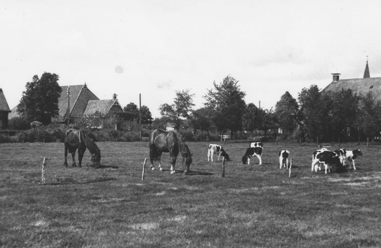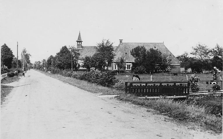 7726 Ter hoogte van de School met den Bijbel kijken we in noordoostelijke richting. Daarbij zien we rechts de boerderij