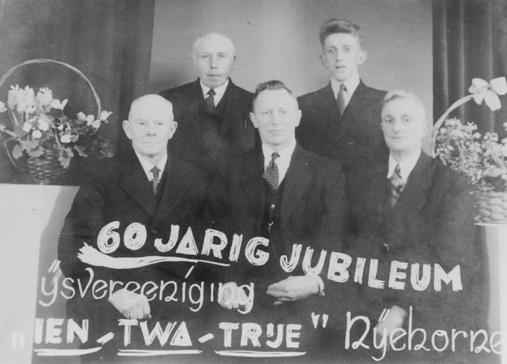 7697 Het bestuur van de ijsclub bij het 60-jarig jubileum (v.l.n.r.): Bonne Bosma, Lútsen van der Woude, Olke Dijksma, Klaas Faber en Bouke Brouwer.