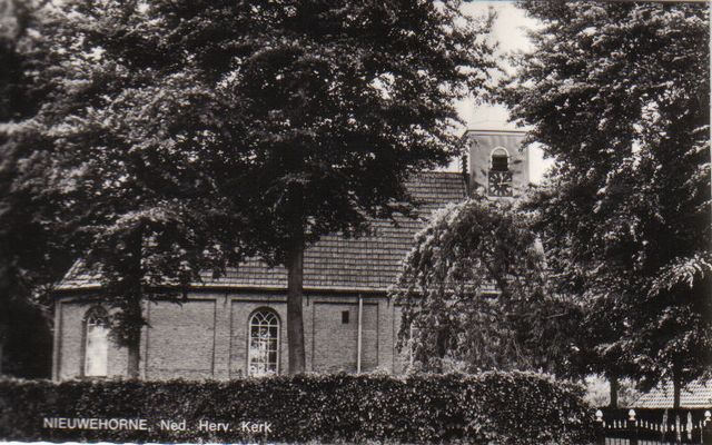 501 Met de bouw van de Nederlands Hervormde kerk in Nieuwehorne werd in 1778 begonnen met steun van toenmalig grietman van Schoterland, Martinus van Scheltinga. In 1779 kwam de kerk gereed. De foto is rond 1969 genomen.