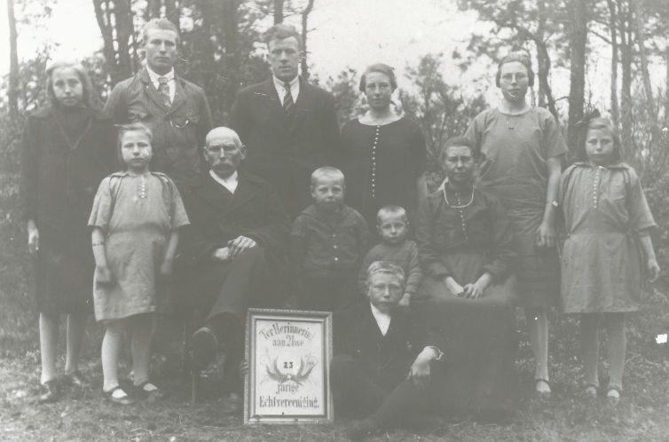 4311 “Ter herinnering aan Uw 25-jarige Echtvereeniging.” Achter (v.l.n.r.): Teatske Stoelwinder, Uilke Stoelwinder, Evert Hof, Griet Stoelwinder, Sjoukje Stoelwinder en Gepke Stoelwinder. Voor (v.l.n.r.): Hiltje Stoelwinder, Wolter Stoelwinder, Minne Stoelwinder, Wieger Stoelwinder en Hendrikje Stoelwinder-Kromhout. Vooraan: Hendrik Stoelwinder.