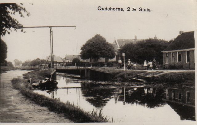 0297 Oudehorne, Tweede Sluis. Rechts bakkerij van Bonne Mulder, daarna van Fokke Weers, Piet Weers en Klaas en Fetje Seinstra. Links van de bakkerij de Openbare School. Links voor: De praam van de melkvaarders Roel en Jan de Boer. Foto omstreeks 1933.