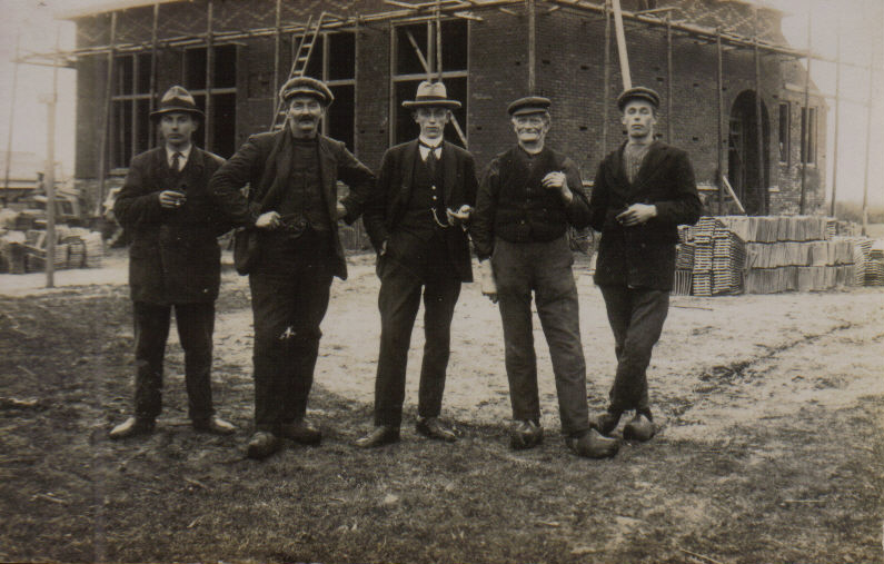 0250 Oudehorne, Christelijke School in aanbouw in 1923. De eerste persoon links is Oebele Jansma, de vierde Martinus van der Sloot. Andere personen ???.