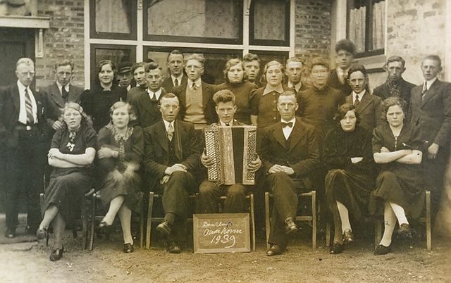 3054 Dansclub Oudehorne in 1939 bij Café Koelma. Achter (v.l.n.r.): Barteld Rozenberg, Uilke Jonker, Lieske Veenstra, Lykele Jonker, Anneke ….?, …. Koopmans, Koene Heida, Barteld van der Wijk, Ibeltje Veenstra, Imke Koen, Aukje Blauw (?), Johannes Bosma, Aukje de Vries,Sietze Drent, Roel Nutters, Jochem Krekt en Anne D. Jonker. Voor (v.l.n.r.): Gepke Klijnstra, Aukje de Jong (zuster van Anton), Klaas koen, Iede de Jong, Timen Koopmans (dansleraar), mevr. Koopmans en Griet de Jong.