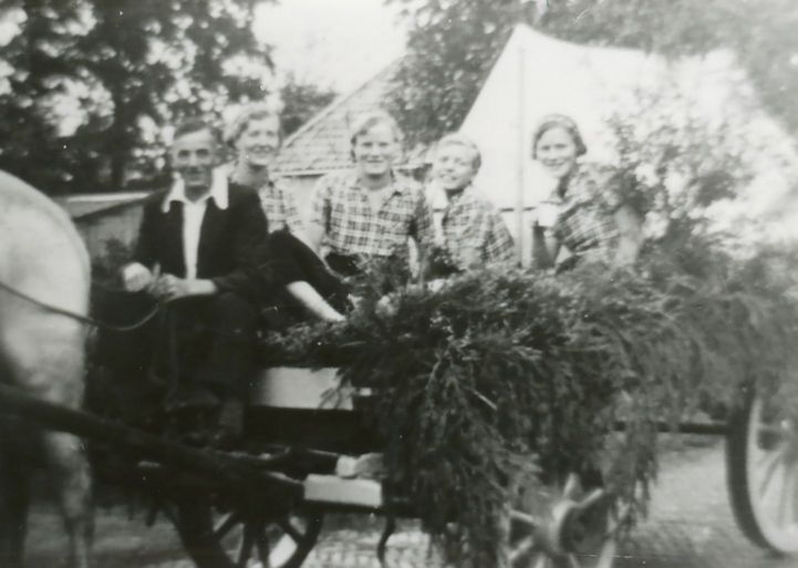 Volksfeest 5195 Menner Else Dijksma. Op de wagen van links naar rechts: Lamkje de Jong, Jantje Duursma, ??? en Wietske Duursma. Gerelateerde Afbeeldingen: