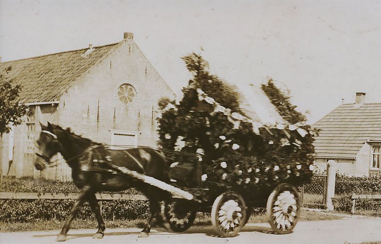 5213 Muziekkorps De Vrije Fries. Tijdens schoolfeesten werd met versierde wagens met kinderen een tocht door het dorp gemaakt. Muziekkorps De Vrije Fries zat dan meestal op de eerste wagen. Hier passeert een wagen het eerste lokaal dat in 1898 was gebouwd. Dit lokaal stond op de plaats van de van de voormalige gereformeerde pastorie en was in 1917 vergroot.