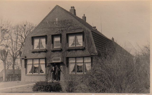 0149 Oudehorne, Schoterlandseweg. Woonhuis met familie Pennings (Nicolaas en Paula Jacobs) bij de voordeur van de Openbare Lagere School.