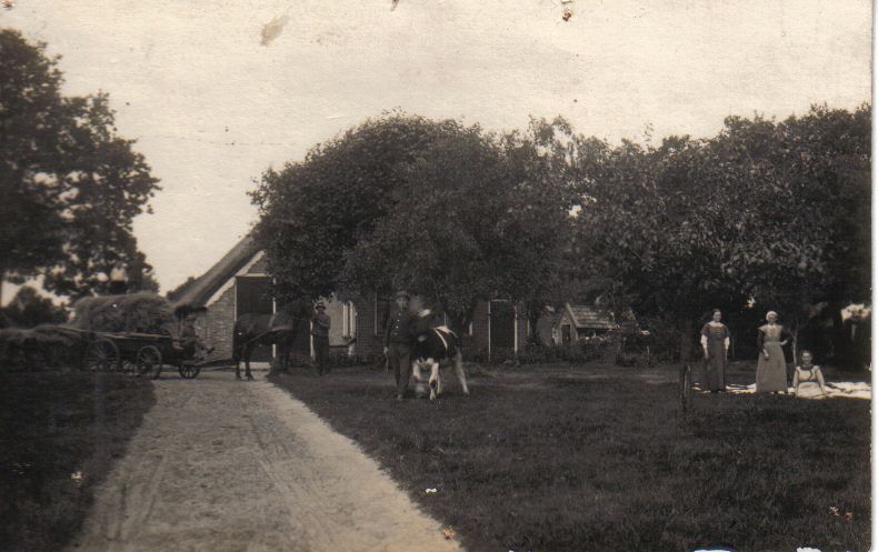 0169 Van links naar rechts: Voerman Hendrik Brouwer, bij het paard Jan Brouwer, bij de koe Hendrikus Brouwer, Johanna Brouwer, Trijntje Brouwer-Post en Atje Brouwer.