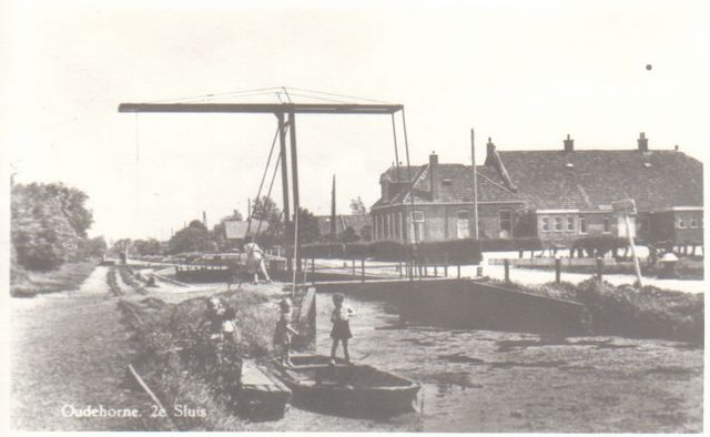 Tweede Sluis 0298 Oudehorne, Tweede Sluis met ophaalbrug en school. Jaar ??? Personen ???. Gerelateerde Afbeeldingen: