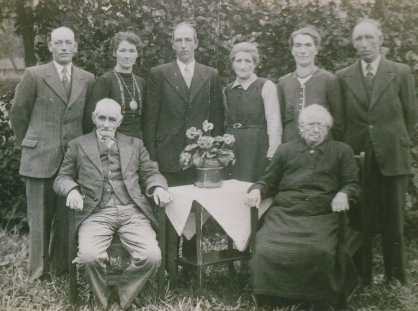 4288 Achter (v.l.n.r.): Sietze de Leeuw, ??, Teunis de Leeuw, ??, ?? en Jacob de Leeuw. Voor (v.l.n.r.): Jeen de Leeuw en Daatje de Leeuw-Betten.